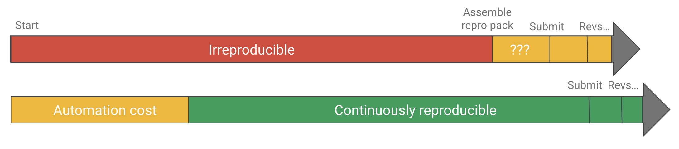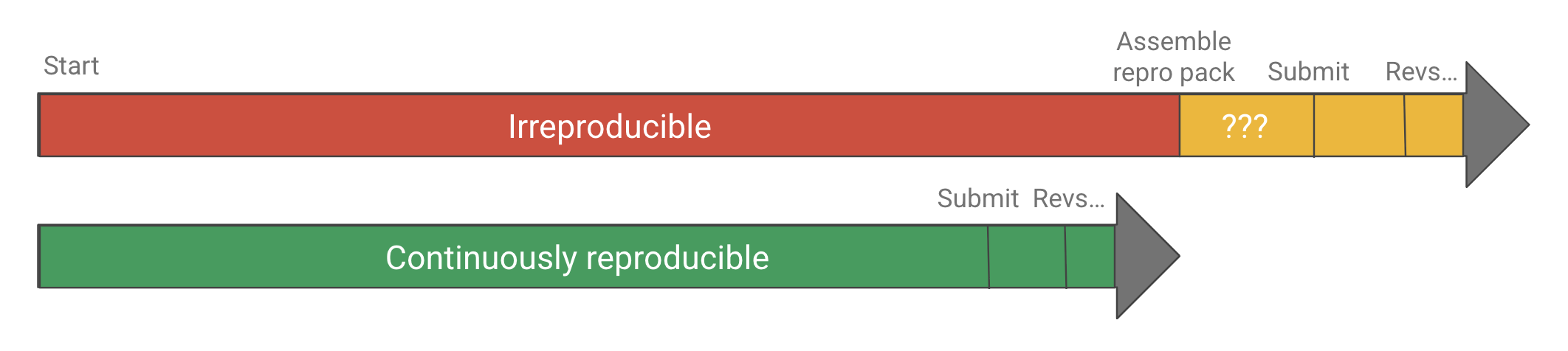 Why assemble a repro pack at the end of a project when it could be used throughout? Imagine instead that the project was automated from the start to be “continuously reproducible”, which is sometimes called practicing continuous analysis, continuous science, or continuous validation. The researcher could do some work on one aspect of the project, save it, push the button to get it into a reproducible state, and then work on the next task. They could quickly and confidently integrate changes from someone else on the team, who could run the project on their own just as easily. In addition to faster iteration cycle time, there would be no more “review anxiety,” worrying if you’ll be asked to change something, either by the principal investigator (PI), a team member, or a referee.